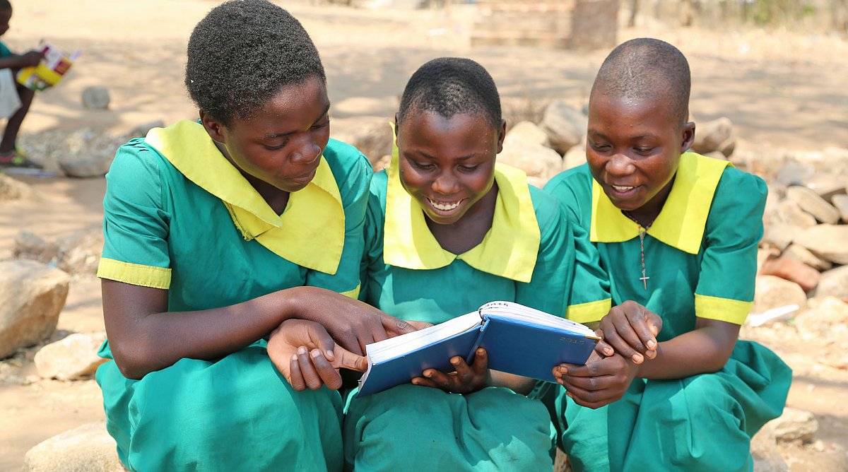 Drei Mädchen in Malawi lesen in einem Buch.