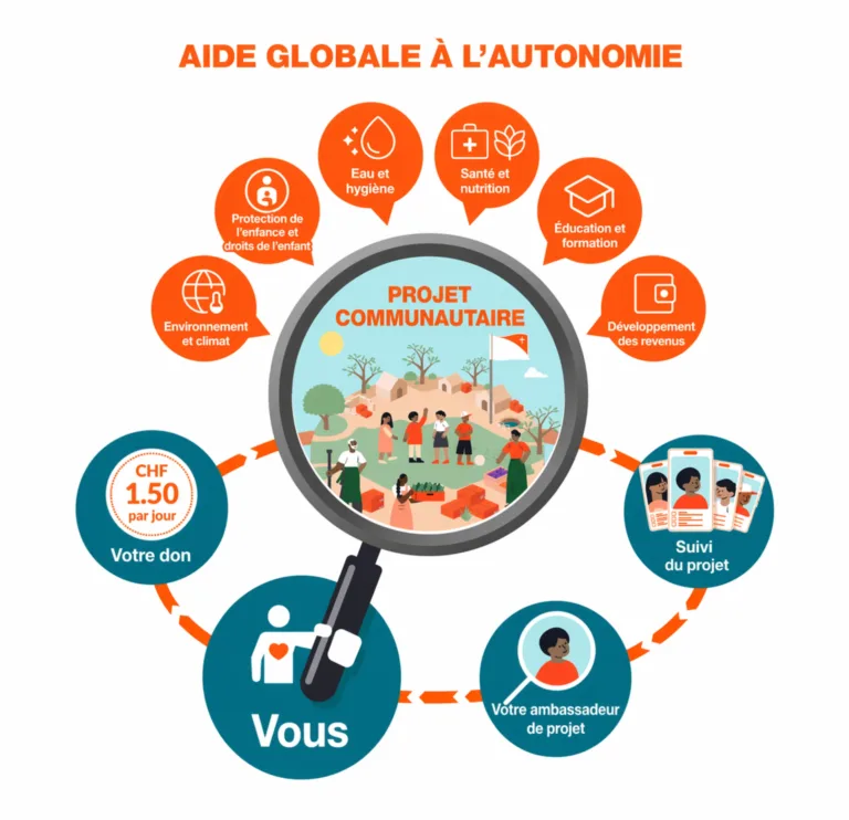 Grâce à votre parrainage d’enfants, vous transformez des communautés entières pour seulement 1,50 CHF par jour. Et vous vivez le développementau cœur même dela région du projet:les ambassadeurs et ambassadrices de projet,choisispar leur communautéen fonction de leurs compétences,vous permettent de vous faire une idée personnelle du projet de développement. Des rapports d’avancementrégulierset des vidéosillustrent comment votre don peut changer la vie des enfants les plus défavorisés, de leurs familles et de leurs communautés. Pour ce faire,notretravail de projets’articuleautour desix domaines vitaux.